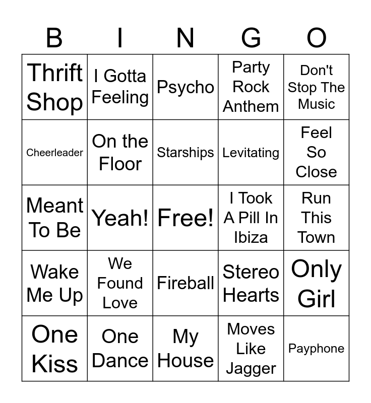 This bingo card has a free space and 49 words: Party in the USA, Payphone, California Gurls, My House, We Found Love, Low, I Gotta Feeling, Closer, Cheerleader, Summer, On the Floor, Party Rock Anthem, Only Girl, Stereo Hearts, Want to Want Me, Like a G6, Starships, I Took A Pill In Ibiza, Give Me Everything, Don't Stop The Music, Yeah!, Moves Like Jagger, Thrift Shop, Levitating, DJ Got Us Fallin' In Love, Feel So Close, One Kiss, Sexy Chick, Fireball, Wake Me Up, Dynamite, Counting Stars, Call Me Maybe, Can't Hold Us, One Dance, Love Yourself, Temperature, Unforgettable, Run This Town, 679, Fire Burning, Time of Our Lives, Down, Stitches, Meant To Be, Psycho, That's What I Like, Umbrella and Good Feeling.