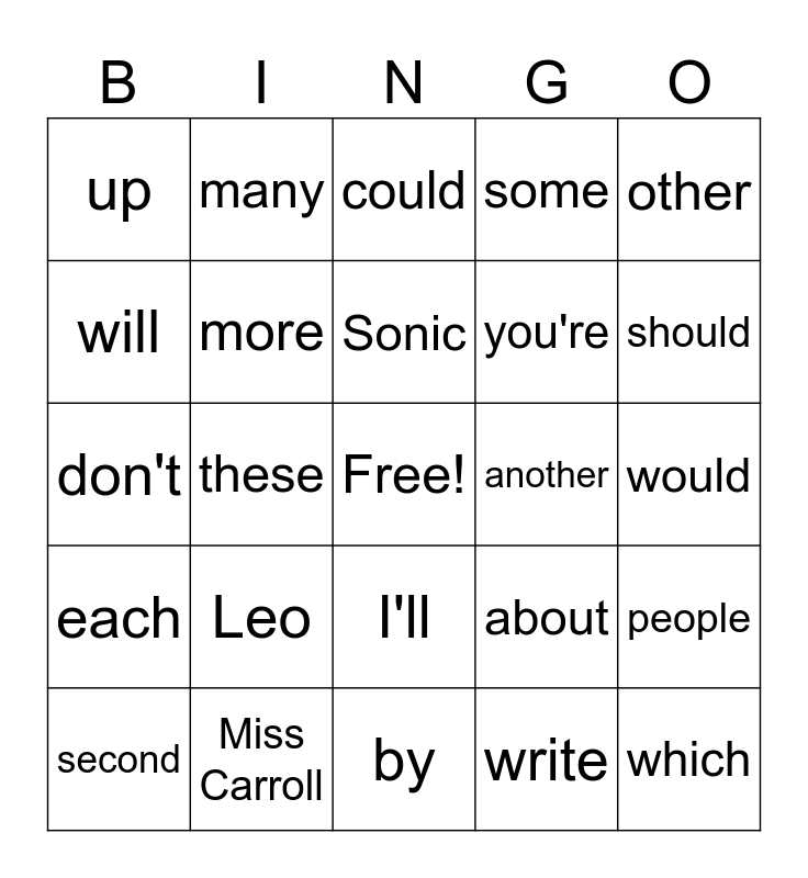 This bingo card has a free space and 24 words: Leo, Miss Carroll, Sonic, second, other, up, will, many, another, I'll, you're, don't, about, people, more, write, would, could, should, these, which, each, some and by.