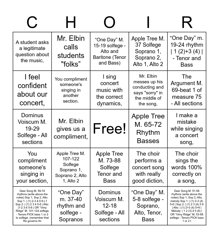 This bingo card has a free space and 45 words: Deer Song M. 51-58 solfege (write beneath the words) Soprano 1, Soprano 2, and Alto 1 (first notes Sop 1: t, Sop 2: f, Altos: r) OR “Vimy Ridge” M. 37-51 - solfege. Tenor 1, Bass 1, and Bass 2 (Basses omit the middle note) First notes should be T, Deer Song M. 51-58 rhythms (write above the notes) Sop 1, Sop 2, Alto, melody Sop 1: | (1) 2-3 (4) 5-6 | Sop 2: | (1) 2 3 (4) 5 6 | Alto: | (1) 2+3 (4) 5+6 | Melody: | 1 2 (3) 4 5 (6) | OR “Vimy Ridge” M. 53-68 solfege - Tenors PICK bass 1 or 2 t, Deer Song M. 59- 74 solfege (stay in a dorian) Write below words. First Notes: A - f, S1 - La’, S2 - La, OR “Vimy Ridge” M. 69-84 solfege - Tenors PICK bass 1 or 2 to solfege Basses 1+2 (remember that La governs this section. First notes should, Deer Song M. 59-74 rhythms (write above the notes) Sop 1, Sop 2, Alto. Sop 1: | (1) 2-3 4-5 6-|-1 Sop 2: | (1) 2 3 4 5-6 | Alto: |1-2 3-4 5-6 | OR “Vimy Ridge” M. 101-124 solfege - Tenors PICK bass 1 or 2 to solfege. (remember that Re governs thi, Deer Song M. 65-79 Solfege and Rhythms. (This section is in e dorian. First solfege for both groups is re) OR “Vimy Ridge” M. 134-149 solfege Tenors PICK bass 1 or 2 to solfege Basses 1+2 (remember that La governs this section. First notes shoul, “One Day” M. 5-8 solfege - Soprano, Alto, Tenor, Bass, “One Day” M. 15-19 solfege - Alto and Baritone (Tenor and Bass), “One Day” M. 19-24 solfege - Alto, Tenor, Bass, “One Day” m. 19-24 rhythm | 1 (2)+3 (4) | - Tenor and Bass, “One Day” m. 37-40 rhythm and solfege - Sopranos, Apple Tree M. 37 Solfege Soprano 1, Soprano 2, Alto 1, Alto 2, Apple Tree M. 65-72 Rhythm Basses, Apple Tree M. 73-88 Solfege Tenor and Bass, Apple Tree M. 107-122 Solfege Soprano 1, Soprano 2, Alto 1, Alto 2, Dominus Voiscum m. 1-11 Sofege - Sopranos, Dominus Voiscum M. 12-18 Solfege - All sections, Dominus Voiscum M. 15-18 Rhythm - Tenors, Dominus Voiscum M. 19-29 Solfege - All sections, Dominus Voiscum M. 21-29 Rhythm - All sections, The Argument M. 69-beat 1 of measure 75 - All sections, Mr. Elbin calls students "folks”, Someone asks a question about the concert,, Students give helpful feedback about a song,, A student asks a legitimate question about the music,, Mr. Elbin plays a wrong note on the piano during warm-ups,, I make a mistake while singing a concert song,, Mr. Elbin shuts a door during rehearsal, I make a mistake while sight reading,, The choir performs a concert song with really good diction,, You compliment someone's singing in your section,, Mr. Elbin gives us a compliment,, The choir sings the words 100% correctly on a song,, Mr. Elbin can't remember my name for a second,, A student asks about what they can wear to the concert... again.,, The choir performs a song with really good dynamics,, Mr. Elbin gives us a compliment,, Your neighbor compliments you on how well you are singing,, I perform our sight reading perfectly,, I sing our concert music with really good facial expression,, I sing concert music with the correct dynamics,, I feel confident about our concert,, Mr. Elbin messes up his conducting and says "sorry" in the middle of the song,, Someone drops something off the back of the risers, You compliment someone's singing in another section. and Mr. Elbin teaches us how to read rhythms.