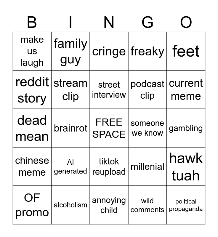 This bingo card has a free space and 24 words: AI generated, alcoholism, street interview, OF promo, feet, make us laugh, reddit story, family guy, someone we know, tiktok reupload, podcast clip, dead mean, millenial, hawk tuah, stream clip, wild comments, gambling, cringe, current meme, brainrot, political propaganda, chinese meme, freaky and annoying child.