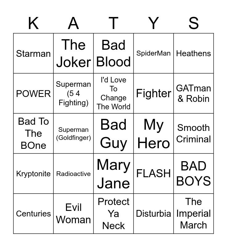 This bingo card has 36 words: Heroes, Heroes & villains, Superheroes, Superman (5 4 Fighting), FLASH, Kryptonite, I'd Love To Change The World, Everybody Wants To Rule The World, Heathens, Superman (Eminem), Superman (Goldfinger), SpiderMan, Ode To a Superhero, My Hero, GATman & Robin, Starman, The Imperial March, Radioactive, Bad Guy, Bad Blood, Smooth Criminal, BAD BOYS, Evil Woman, Centuries, Protect Ya Neck, The Joker, Bad To The BOne, Mask Off, Fighter, POWER, Stronger, Cruella De Vill, Disturbia, Mary Jane, Rider On The Storm and Intergalactic.