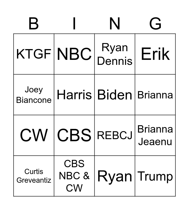 This bingo card has 20 words: Brianna Jeaenu, Erik Johnson, Ryan Dennis, KRTV, Curtis Greveantiz, Joey Biancone, CBS NBC & CW, KTGF, CW, NBC, CBS, REBCJ, Harris, Trump, Biden, Vance, Brianna, Erik, Ryan and Montana Department of Fish, Wildlife & Parks.