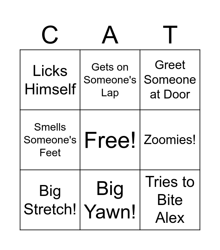 This bingo card has a free space and 17 words: Unprompted Wiggly Worm, Meow!, Greet Someone at Door, Licks Himself, Knocks Something off Table (Or Tries To), Smells Someone's Feet, Hides in Bedroom, Big Stretch!, Big Yawn!, Zoomies!, Almost Trips Someone, Gets on Something He Shouldn't, Tries to Bite Alex, Gets on Someone's Lap, Scratches Post, Plays with Toy Unprompted and Barfs :(.