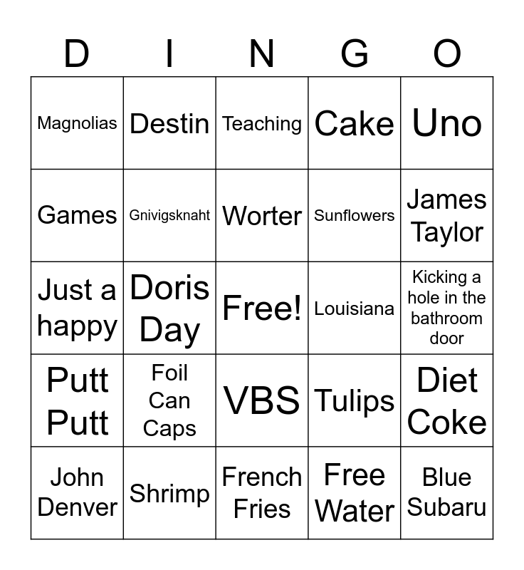This bingo card has a free space and 37 words: Fritos, Pokerkeeno, Reading, Gnivigsknaht, Diet Coke, Foil Can Caps, Worter, Bean dip, Uno, The Beach, Doris Day, Cake, Blue Subaru, Kicking a hole in the bathroom door, Games, Putt Putt, Discovery Toys, Teaching, VBS, Louisiana, Magnolias, James Taylor, John Denver, French Fries, Hasbro Toys, Free Water, Destin, Hawaii, 65 years old, 1961, 5 grandchildren + a pop-pop, Shrimp, Just a happy, Carol king, Tulips, Sunflowers and Alaska.