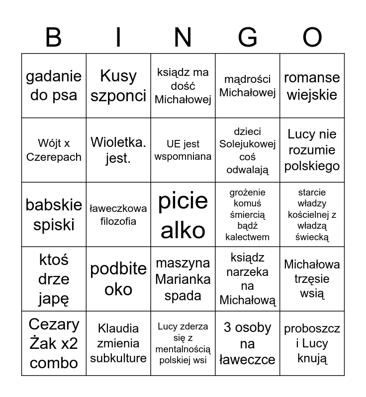 This bingo card has a free space and 24 words: podbite oko, Klaudia zmienia subkulture, UE jest wspomniana, Cezary Żak x2 combo, romanse wiejskie, gadanie do psa, Wójt x Czerepach, Kusy szponci, grożenie komuś śmiercią bądź kalectwem, maszyna Marianka spada, dzieci Solejukowej coś odwalają, babskie spiski, ksiądz narzeka na Michałową, Michałowa trzęsie wsią, Wioletka. jest., 3 osoby na ławeczce, starcie władzy kościelnej z władzą świecką, ksiądz ma dość Michałowej, Lucy nie rozumie polskiego, ławeczkowa filozofia, proboszcz i Lucy knują, ktoś drze japę, mądrości Michałowej and Lucy zderza się z mentalnością polskiej wsi.