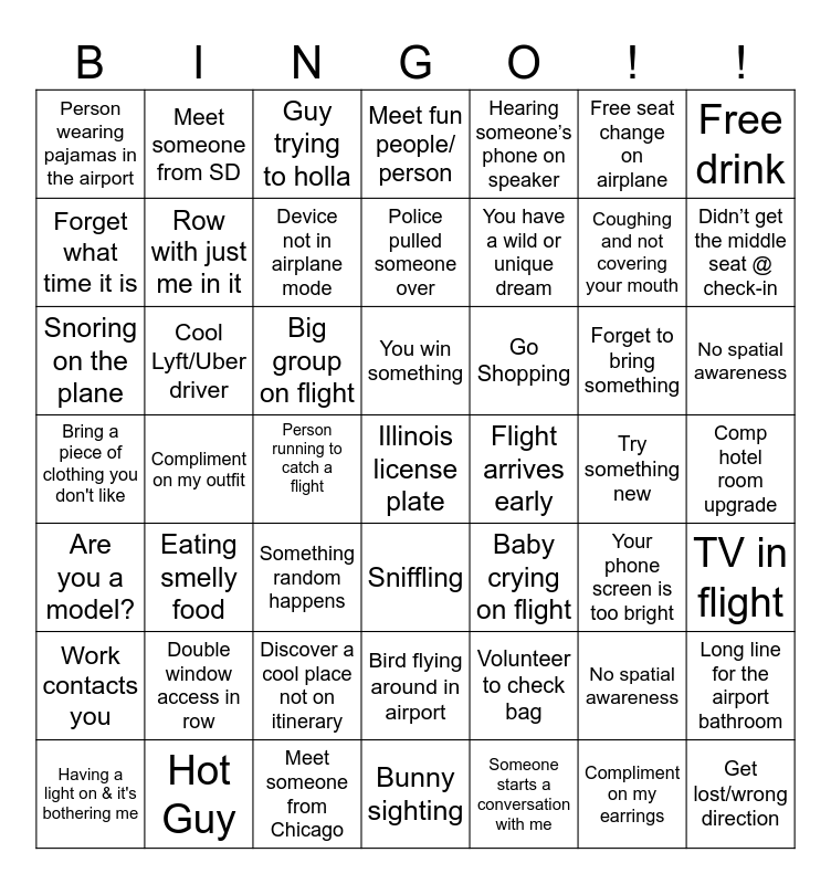 This bingo card has 49 words: No spatial awareness, Coughing and not covering your mouth, Someone starts a conversation with me, Compliment on my outfit, Big group on flight, Comp hotel room upgrade, Meet someone from SD, Meet someone from Chicago, Free seat change on airplane, Sniffling, Free drink, Meet fun people/ person, Forget to bring something, Go Shopping, Double window access in row, Try something new, Forget what time it is, Didn’t get the middle seat @ check-in, Long line for the airport bathroom, Hearing someone’s phone on speaker, You have a wild or unique dream, Person running to catch a flight, Person wearing pajamas in the airport, Row with just me in it, Having a light on & it's bothering me, Device not in airplane mode, No spatial awareness, Hot Guy, You win something, Cool Lyft/Uber driver, Get lost/wrong direction, Flight arrives early, Work contacts you, Discover a cool place not on itinerary, Bring a piece of clothing you don't like, Baby crying on flight, Your phone screen is too bright, TV in flight, Snoring on the plane, Something random happens, Bird flying around in airport, Are you a model?, Illinois license plate, Bunny sighting, Police pulled someone over, Guy trying to holla, Volunteer to check bag, Eating smelly food and Compliment on my earrings.