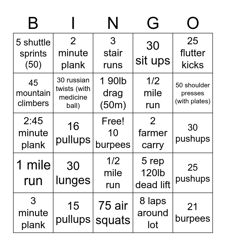 This bingo card has a free space and 24 words: 30 lunges, 15 pullups, 1 90lb drag (50m), 3 minute plank, 25 flutter kicks, 5 shuttle sprints (50), 45 mountain climbers, 2 minute plank, 2 farmer carry, 1/2 mile run, 1/2 mile run, 2:45 minute plank, 5 rep 120lb dead lift, 25 pushups, 30 russian twists (with medicine ball), 8 laps around lot, 30 pushups, 3 stair runs, 50 shoulder presses (with plates), 16 pullups, 21 burpees, 1 mile run, 30 sit ups and 75 air squats.