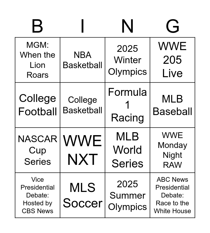 This bingo card has 24 words: Super Bowl LXI, The Super Bowl Today, MLB Baseball, NHL Hockey, College Football, MGM: When the Lion Roars, College Basketball, NBA Basketball, MLS Soccer, NFL Football, NASCAR Cup Series, MLB World Series, IndyCar Racing, Scooby-Doo! & Teenage Mutant Ninja Turtles, Formula 1 Racing, NBA Finals, 2025 Summer Olympics, 2025 Winter Olympics, WWE NXT, WWE Monday Night RAW, Vice Presidential Debate: Hosted by CBS News, ABC News Presidential Debate: Race to the White House, WWE 205 Live and WWE Friday Night SmackDown.