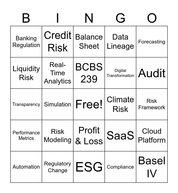 This bingo card has a free space and 50 words: IFRS 9, Basel IV, Stress Testing, ESG, Risk Modeling, Scenario Analysis, Credit Risk, Market Risk, Liquidity Risk, Regulatory Reporting, Real-Time Analytics, Data Lineage, Cloud Platform, SaaS, Financial Modeling, Capital Adequacy, BCBS 239, Climate Risk, Portfolio, Forecasting, Simulation, Compliance, Banking Regulation, Digital Transformation, AI Analytics, Data Governance, Audit, Internal Controls, Balance Sheet, Profit & Loss, Risk Appetite, Stress Scenario, What-If Analysis, Financial Institution, Regulatory Change, Reporting Deadline, Model Validation, ESG Reporting, Financial Data, Risk Framework, Core Banking, Financial Software, Regulatory Authority, Data Accuracy, Automation, Transparency, Financial Stability, Decision Support, Performance Metrics and Strategic Insights.