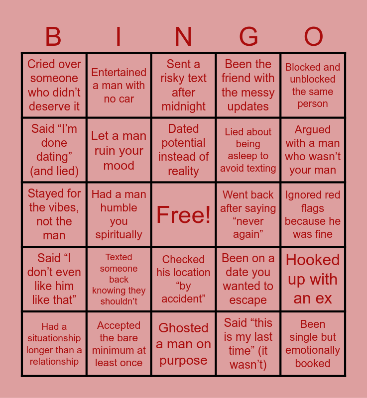 This bingo card has a free space and 25 words: Texted someone back knowing they shouldn’t, Ghosted a man on purpose, Dated potential instead of reality, Had a situationship longer than a relationship, Blocked and unblocked the same person, Cried over someone who didn’t deserve it, Said “I’m done dating” (and lied), Entertained a man with no car, Went back after saying “never again”, Checked his location “by accident”, Lied about being asleep to avoid texting, Stayed for the vibes, not the man, Been on a date you wanted to escape, Hooked up with an ex, Let a man ruin your mood, Said “I’m healing” while still toxic, Ignored red flags because he was fine, Sent a risky text after midnight, Argued with a man who wasn’t your man, Had a man humble you spiritually, Been single but emotionally booked, Accepted the bare minimum at least once, Said “I don’t even like him like that”, Been the friend with the messy updates and Said “this is my last time” (it wasn’t).
