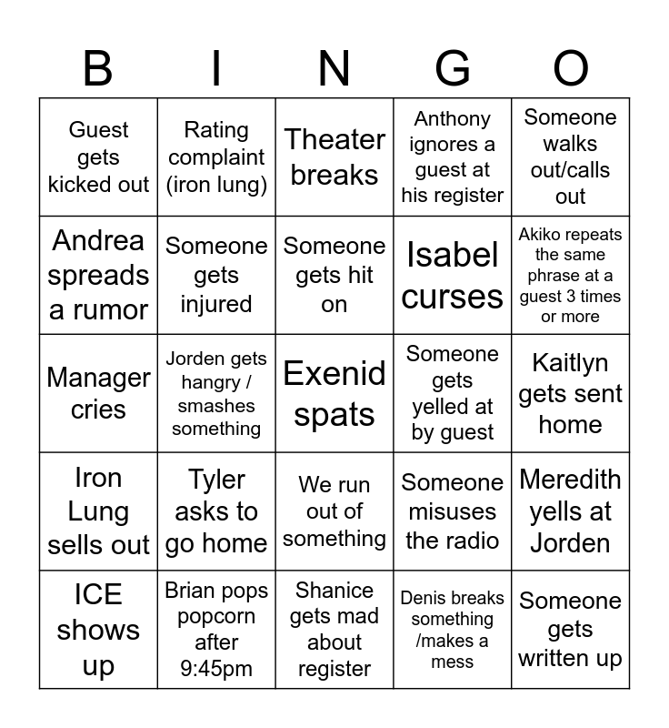 This bingo card has a free space and 24 words: Tyler asks to go home, Brian pops popcorn after 9:45pm, Someone gets hit on, ICE shows up, Someone walks out/calls out, Guest gets kicked out, Andrea spreads a rumor, Rating complaint (iron lung), Someone gets yelled at by guest, We run out of something, Isabel curses, Manager cries, Someone misuses the radio, Meredith yells at Jorden, Someone gets injured, Denis breaks something /makes a mess, Kaitlyn gets sent home, Theater breaks, Akiko repeats the same phrase at a guest 3 times or more, Jorden gets hangry / smashes something, Someone gets written up, Iron Lung sells out, Anthony ignores a guest at his register and Shanice gets mad about register.