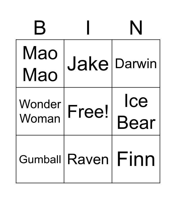 This bingo card has a free space and 11 words: Robin, Raven, Finn, Gumball, Jake, Darwin, Ice Bear, Grizzly, Wonder Woman, Mao Mao and Panda.