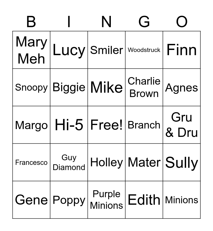 This bingo card has a free space and 29 words: Gene, Jailbreak, Hi-5, Mel Meh, Mary Meh, Smiler, Biggie, Guy Diamond, Branch, Poppy, Gru & Dru, Minions, Purple Minions, Edith, Agnes, Lightning, Holley, Francesco, Finn, Margo, Mater, Luigi, Charlie Brown, Snoopy, Woodstruck, Lucy, Sully, Mike and Art.