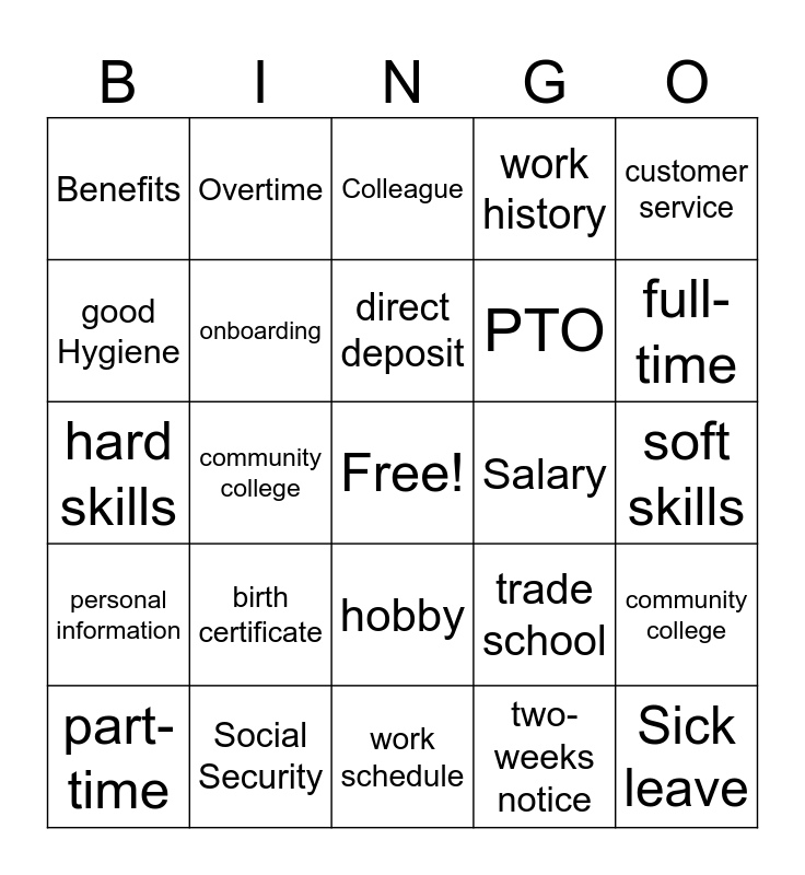 This bingo card has a free space and 24 words: part-time, birth certificate, direct deposit, two-weeks notice, customer service, Benefits, Overtime, Colleague, Salary, soft skills, hard skills, onboarding, trade school, community college, good Hygiene, Social Security, work schedule, work history, full-time, personal information, community college, hobby, PTO and Sick leave.