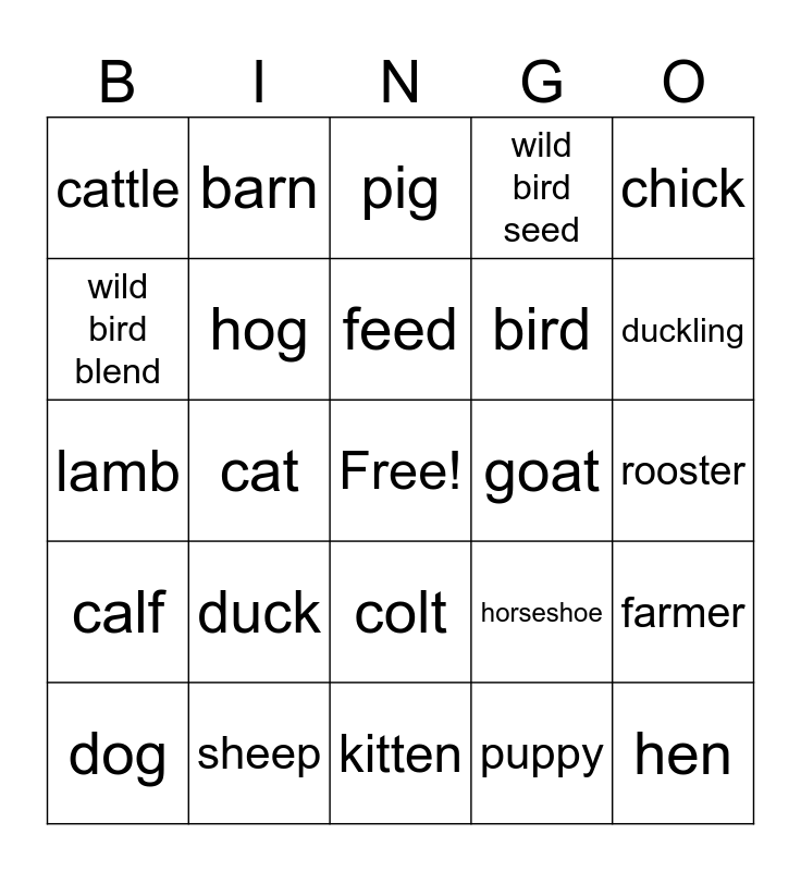 This bingo card has a free space and 29 words: dog, cow, cat, horse, cattle, pig, hog, duck, goat, sheep, rooster, hen, kitten, puppy, duckling, piglet, colt, calf, chick, lamb, horseshoe, birdcage, bird, wild bird blend, wild bird seed, barn, farmer, feed and food.