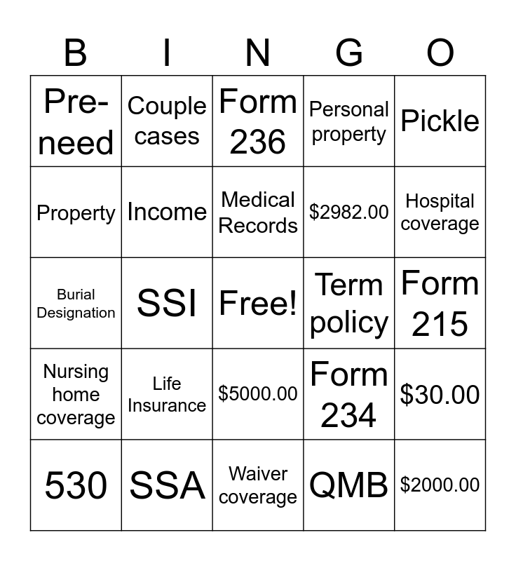 This bingo card has a free space and 29 words: 530, SLMB, SSI, Resources, Pre-need, Form 236, Income, Life Insurance, Term policy, SSA, Form 215, $2000.00, Waiver coverage, QMB, Hospital coverage, Offset, $5000.00, Nursing home coverage, Pickle, Burial Designation, Form 234, Dac, $2982.00, Property, Personal property, Couple cases, $30.00, Medical Records and Emergency Services.