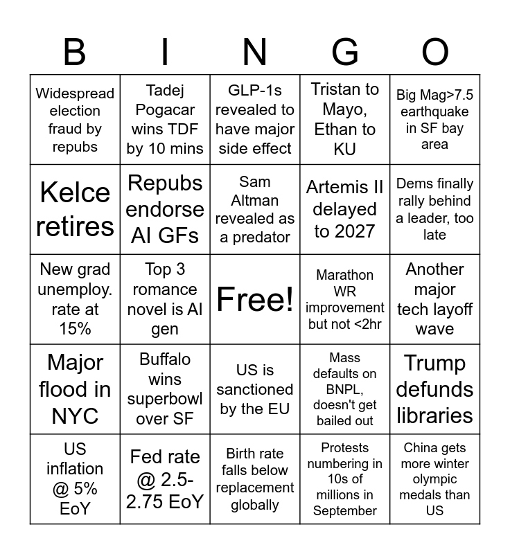 This bingo card has a free space and 24 words: Buffalo wins superbowl over SF, Fed rate @ 2.5-2.75 EoY, Sam Altman revealed as a predator, US inflation @ 5% EoY, Big Mag>7.5 earthquake in SF bay area, Widespread election fraud by repubs, Kelce retires, Tadej Pogacar wins TDF by 10 mins, Marathon WR improvement but not <2hr, US is sanctioned by the EU, Artemis II delayed to 2027, New grad unemploy. rate at 15%, Mass defaults on BNPL, doesn't get bailed out, Trump defunds libraries, Repubs endorse AI GFs, Protests numbering in 10s of millions in September, Another major tech layoff wave, GLP-1s revealed to have major side effect, Dems finally rally behind a leader, too late, Top 3 romance novel is AI gen, China gets more winter olympic medals than US, Major flood in NYC, Tristan to Mayo, Ethan to KU and Birth rate falls below replacement globally.