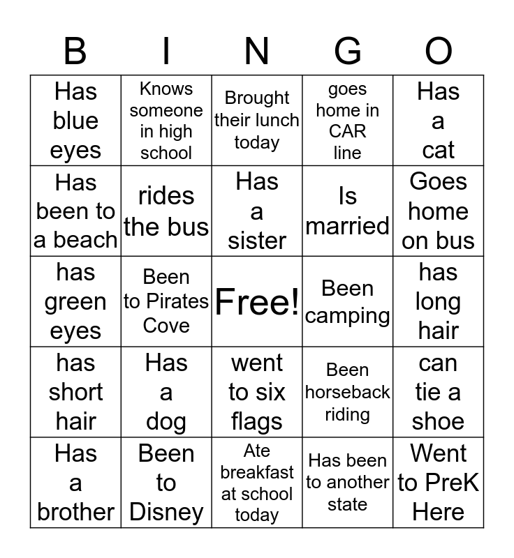 This bingo card has a free space and 24 words: Has a dog, Been to Disney, Has a sister, Has a brother, Has a cat, Has blue eyes, Has been to a beach, Knows someone in high school, Been camping, went to six flags, Is married, has green eyes, Been horseback riding, can tie a shoe, rides the bus, Has been to another state, has long hair, Brought their lunch today, Goes home on bus, Been to Pirates Cove, Went to PreK Here, has short hair, goes home in CAR line and Ate breakfast at school today.