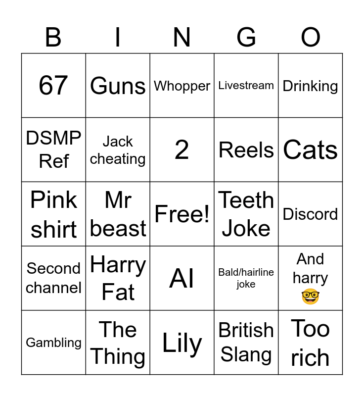This bingo card has a free space and 24 words: Harry Fat, The Thing, 2, Gambling, Drinking, 67, DSMP Ref, Guns, Teeth Joke, AI, Reels, Pink shirt, Bald/hairline joke, And harry 🤓, Jack cheating, British Slang, Discord, Whopper, Cats, Mr beast, Too rich, Second channel, Livestream and Lily.