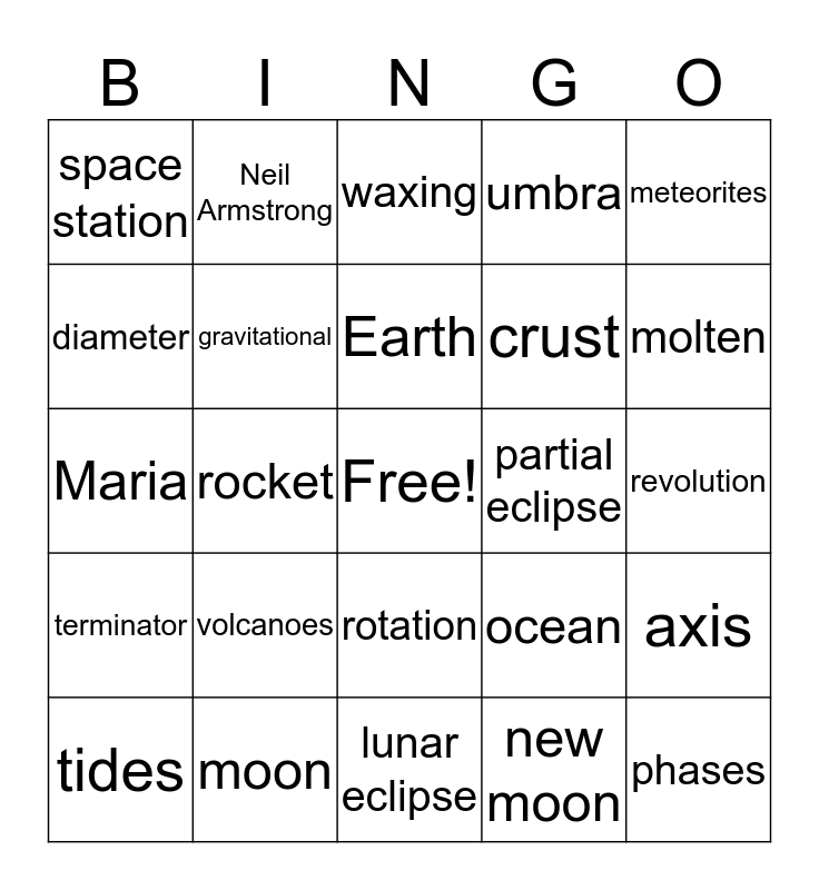 This bingo card has a free space and 24 words: volcanoes, moon, Earth, tides, meteorites, space station, diameter, Neil Armstrong, partial eclipse, rotation, crust, Maria, ocean, axis, gravitational, new moon, revolution, waxing, molten, rocket, phases, terminator, umbra and lunar eclipse.