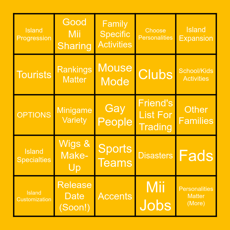 This bingo card has a free space and 24 words: Wigs & Make-Up, Release Date (Soon!), Mouse Mode, Island Customization, Island Expansion, Island Progression, Tourists, Good Mii Sharing, Friend's List For Trading, Sports Teams, Clubs, OPTIONS, Disasters, Fads, Rankings Matter, Mii Jobs, Other Families, Family Specific Activities, School/Kids Activities, Minigame Variety, Personalities Matter (More), Island Specialties, Choose Personalities and Accents.
