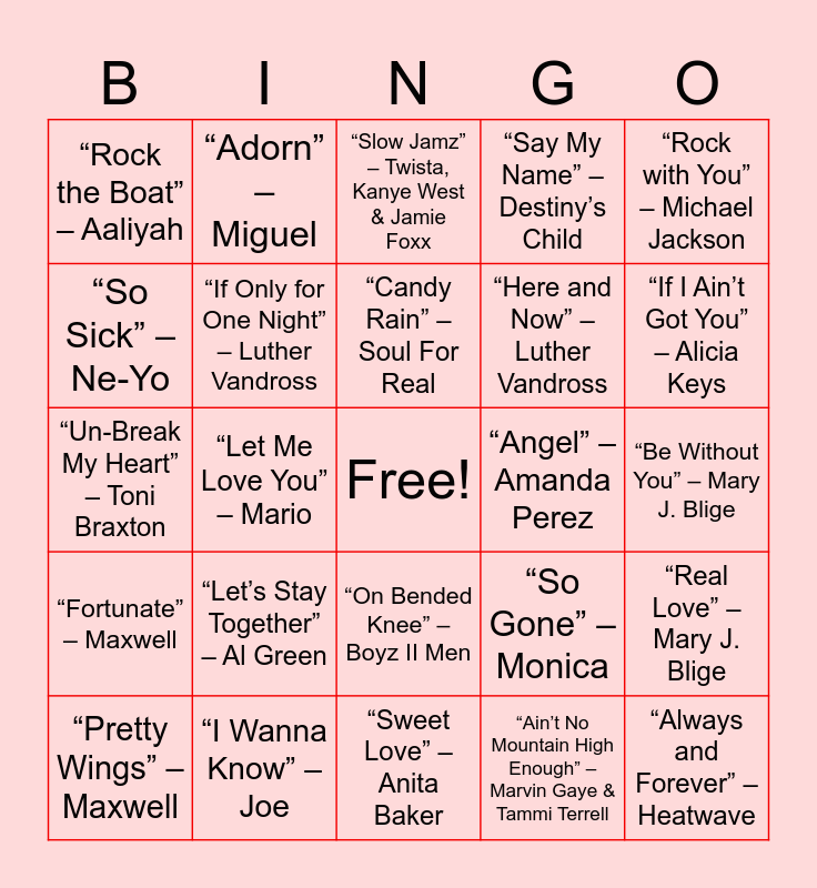 This bingo card has a free space and 89 words: “End of the Road” – Boyz II Men, “I’ll Make Love to You” – Boyz II Men, “On Bended Knee” – Boyz II Men, “Always Be My Baby” – Mariah Carey, “We Belong Together” – Mariah Carey, “Whenever You Call” – Mariah Carey, “Can We Talk” – Tevin Campbell, “Weak” – SWV, “Don’t Let Go (Love)” – En Vogue, “Nobody” – Keith Sweat, “I’ll Give All My Love to You” – Keith Sweat, “Make It Last Forever” – Keith Sweat, “Real Love” – Mary J. Blige, “Be Without You” – Mary J. Blige, “If You Love Me” – Brownstone, “Candy Rain” – Soul For Real, “Every Little Thing I Do” – Soul For Real, “Love U 4 Life” – Jodeci, “Forever My Lady” – Jodeci, “My Heart Belongs to You” – Jodeci, “Before I Let Go” – Blackstreet, “You Bring Me Joy” – Anita Baker, “Sweet Love” – Anita Baker, “You’re Making Me High” – Toni Braxton, “Un-Break My Heart” – Toni Braxton, “I Wanna Know” – Joe, “Crazy in Love” – Beyoncé, “U Got It Bad” – Usher, “Burn” – Usher, “Cater 2 U” – Destiny’s Child, “Say My Name” – Destiny’s Child, “Let Me Love You” – Mario, “Dilemma” – Nelly & Kelly Rowland, “Rock the Boat” – Aaliyah, “Love” – Keyshia Cole, “Slow Jamz” – Twista, Kanye West & Jamie Foxx, “So Sick” – Ne-Yo, “No One” – Alicia Keys, “If I Ain’t Got You” – Alicia Keys, “Pretty Wings” – Maxwell, “Fortunate” – Maxwell, “Ascension (Don’t Ever Wonder)” – Maxwell, “Into You” – Tamia, “Officially Missing You” – Tamia, “So Gone” – Monica, “Angel” – Amanda Perez, “Differences” – Ginuwine, “Made to Love Ya” – Gerald Levert, “This Is Why I Love You” – Major, “Adorn” – Miguel, “Sure Thing” – Miguel, “Best Part” – Daniel Caesar & H.E.R., “Focus” – H.E.R., “Damage” – H.E.R., “Thinkin Bout You” – Frank Ocean, “Love on the Brain” – Rihanna, “Boo’d Up” – Ella Mai, “Trip” – Ella Mai, “All of Me” – John Legend, “Golden” – Jill Scott, “Love Galore” – SZA, “The Worst” – Jhene Aiko, “Playing Games” – Summer Walker, “Foolish” – Ashanti, “Happy” – Ashanti, “Baby” – Ashanti, “Respect” – Aretha Franklin, “Natural Woman” – Aretha Franklin, “Until You Come Back to Me” – Aretha Franklin, “Let’s Stay Together” – Al Green, “Always and Forever” – Heatwave, “Never Too Much” – Luther Vandross, “Always and Forever” – Luther Vandross, “Here and Now” – Luther Vandross, “If Only for One Night” – Luther Vandross, “Ain’t No Mountain High Enough” – Marvin Gaye & Tammi Terrell, “Let’s Get It On” – Marvin Gaye, “Sexual Healing” – Marvin Gaye, “Lovely Day” – Bill Withers, “Just the Two of Us” – Grover Washington Jr. & Bill Withers, “Rock with You” – Michael Jackson, “You Are Everything” – The Stylistics, “Lady” – The Stylistics, “Ribbon in the Sky” – Stevie Wonder, “Love Calls” – Kem, “For the Love of You” – The Isley Brothers, “At Your Best (You Are Love)” – The Isley Brothers, “Between the Sheets” – The Isley Brothers and “Forever” – Chris Brown.
