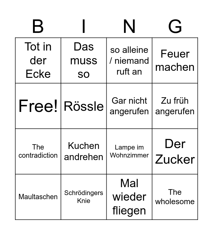 This bingo card has 16 words: Schrödingers Knie, Der Zucker, so alleine / niemand ruft an, Tot in der Ecke, The contradiction, Das muss so, Lampe im Wohnzimmer, Mal wieder fliegen, Free!, Rössle, Maultaschen, Feuer machen, Kuchen andrehen, Zu früh angerufen, Gar nicht angerufen and The wholesome.