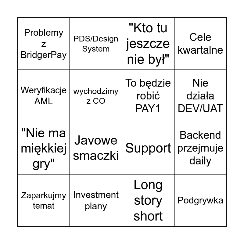 This bingo card has 16 words: Investment plany, Backend przejmuje daily, "Kto tu jeszcze nie był", Problemy z BridgerPay, "Nie ma miękkiej gry", PDS/Design System, Support, Long story short, Weryfikacje AML, wychodzimy z CO, Zaparkujmy temat, Cele kwartalne, Javowe smaczki, Nie działa DEV/UAT, To będzie robić PAY1 and Podgrywka.