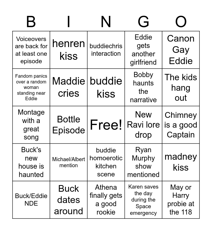This bingo card has a free space and 29 words: Buck/Eddie NDE, Baby Han name changed, Bottle Episode, Series consistency!, Voiceovers are back for at least one episode, buddiechris interaction, Maddie cries, Michael/Albert mention, New Ravi lore drop, Buck dates around, Chimney is a good Captain, May or Harry probie at the 118, Athena finally gets a good rookie, Karen saves the day during the Space emergency, The kids hang out, Nashville Crossover, buddie homoerotic kitchen scene, Buck's new house is haunted, Canon Gay Eddie, Montage with a great song, Ryan Murphy show mentioned, Tim Minear steals from Ryan Guzman's life again, Bobby haunts the narrative, Fandom panics over a random woman standing near Eddie, Eddie gets another girlfriend, henren kiss, madney kiss, buddie kiss and Ravi gets a li.