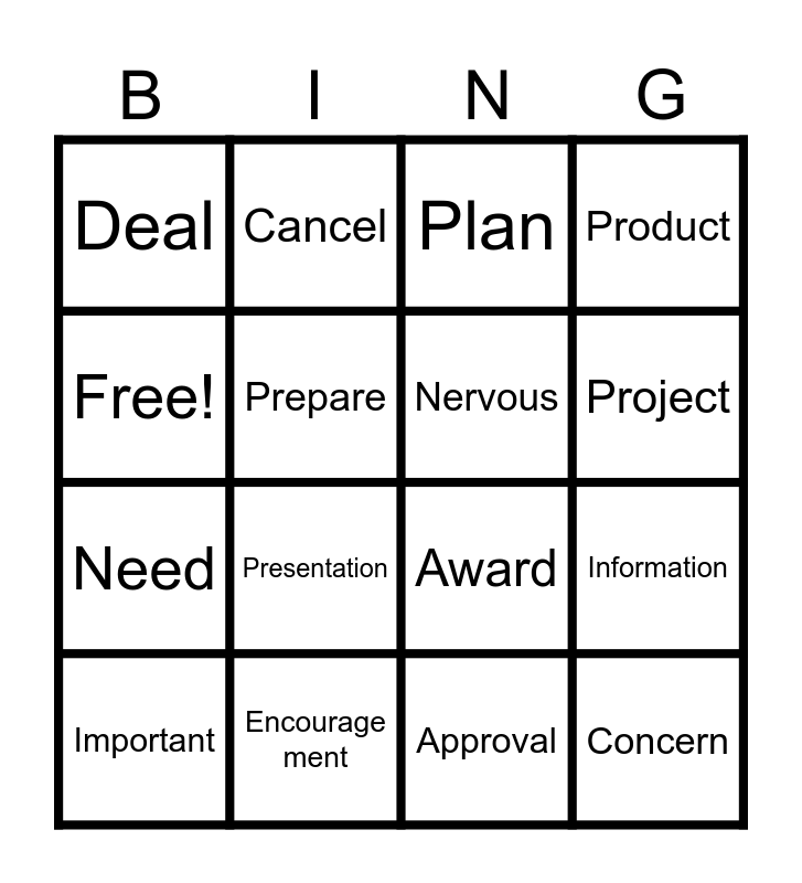 This bingo card has 16 words: Encourage ment, Information, Plan, Deal, Need, Cancel, Award, Approval, Free!, Prepare, Important, Product, Presentation, Project, Nervous and Concern.