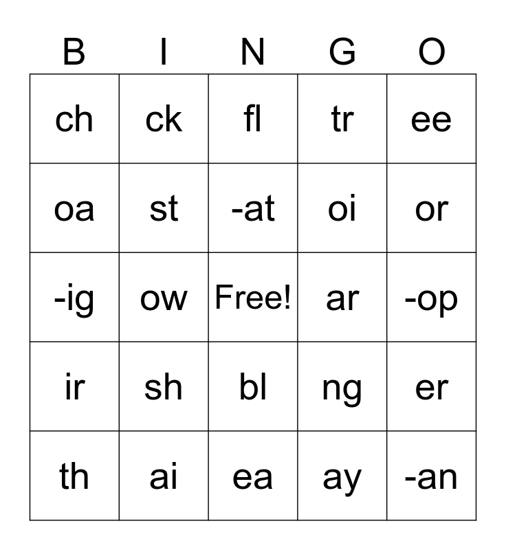 This bingo card has a free space and 24 words: sh, ai, -at, th, ee, ch, oa, ck, ar, bl, oi, -ig, ng, er, st, ay, -op, fl, or, ow, -an, ir, tr and ea.