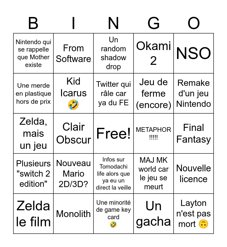 This bingo card has a free space and 24 words: Nouveau Mario 2D/3D?, Monolith, Twitter qui râle car ya du FE, Zelda le film, NSO, Nintendo qui se rappelle que Mother existe, Une merde en plastique hors de prix, From Software, METAPHOR !!!!!, Infos sur Tomodachi life alors que ya eu un direct la veille, Jeu de ferme (encore), Zelda, mais un jeu, MAJ MK world car le jeu se meurt, Nouvelle licence, Kid Icarus 🤣, Un gacha, Final Fantasy, Un random shadow drop, Remake d'un jeu Nintendo, Clair Obscur, Layton n'est pas mort 🙃, Plusieurs "switch 2 edition", Okami 2 and Une minorité de game key card 🤣.