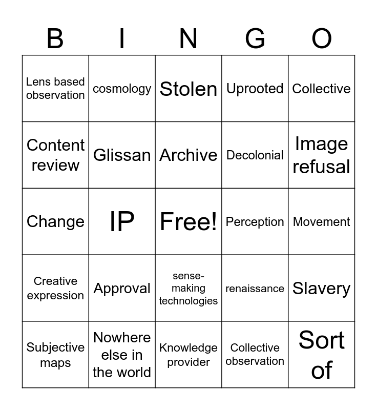 This bingo card has a free space and 37 words: Sonic method, Inspection, Choreography, Glissan, Slavery, Approval, Archive, Memory, Collective, Transmutation, IP, Uprooted, Sort of, Movement, Content review, Creative expression, Continuity, Stolen, sense-making technologies, Perception, Lens based observation, Image refusal, Subjective maps, Knowledge provider, reminiscent of ruins, Collective observation, cosmology, observation methods, philosophical explorations, Tools, GP, Nowhere else in the world, Change, Youth, renaissance, Decolonial and Observer.