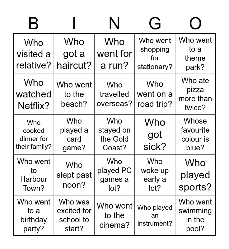 This bingo card has 25 words: Who slept past noon?, Who went to the cinema?, Who travelled overseas?, Who went to a birthday party?, Who went to a theme park?, Who visited a relative?, Who watched Netflix?, Who got a haircut?, Who got sick?, Who played PC games a lot?, Who went on a road trip?, Who cooked dinner for their family?, Who woke up early a lot?, Who played sports?, Who went to the beach?, Who went swimming in the pool?, Whose favourite colour is blue?, Who went for a run?, Who ate pizza more than twice?, Who played a card game?, Who stayed on the Gold Coast?, Who was excited for school to start?, Who went to Harbour Town?, Who went shopping for stationary? and Who played an instrument?.