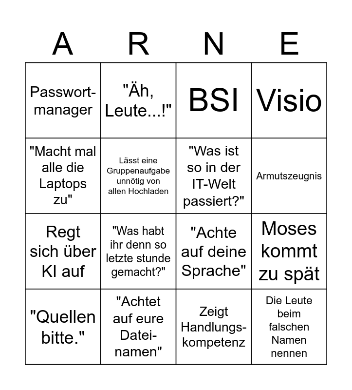 This bingo card has 19 words: "Achte auf deine Sprache", Canio kommt zu spät, BSI, Die Leute beim falschen Namen nennen, Moses kommt zu spät, "Macht mal alle die Laptops zu", Zeigt Handlungs-kompetenz, Passwort-manager, "Äh, Leute...!", Regt sich über KI auf, "Was habt ihr denn so letzte stunde gemacht?", Lässt eine Gruppenaufgabe unnötig von allen Hochladen, "Was ist so in der IT-Welt passiert?", "Achtet auf eure Datei-namen", "Quellen bitte.", "Willst ne 5 in der Mitarbeit?", Visio, Armutszeugnis and Zeigt Mitarbeits-PDF.