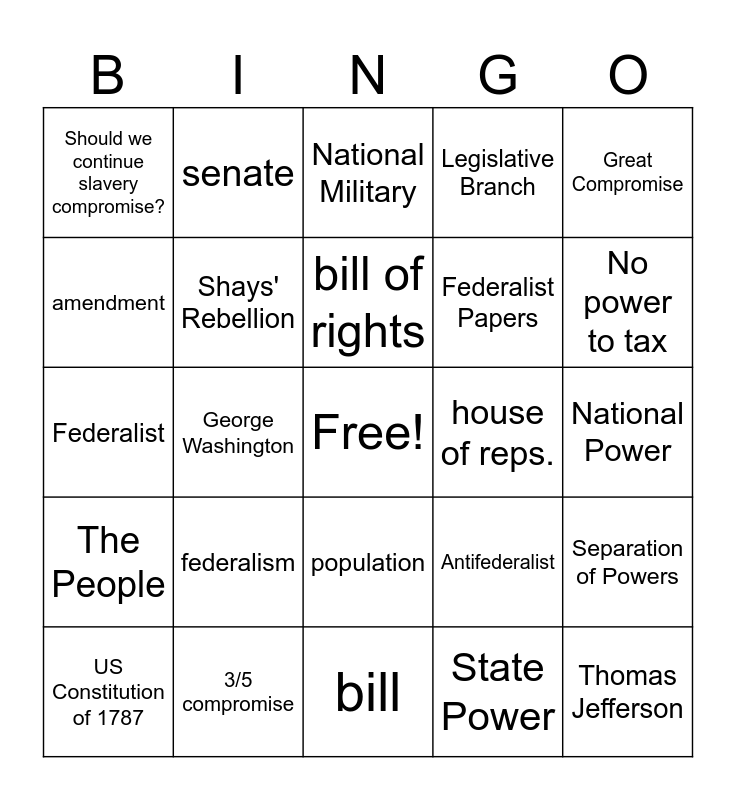 This bingo card has a free space and 24 words: federalism, 3/5 compromise, bill of rights, US Constitution of 1787, Great Compromise, Should we continue slavery compromise?, amendment, senate, house of reps., population, Federalist Papers, Federalist, Antifederalist, Separation of Powers, Shays' Rebellion, State Power, National Power, National Military, No power to tax, George Washington, Thomas Jefferson, The People, Legislative Branch and bill.