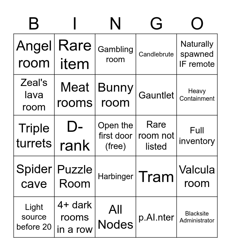 This bingo card has a free space and 24 words: Puzzle Room, 4+ dark rooms in a row, Bunny room, Light source before 20, Naturally spawned IF remote, Angel room, Zeal's lava room, Rare item, Rare room not listed, Harbinger, Gauntlet, Triple turrets, Tram, Valcula room, Meat rooms, p.AI.nter, Full inventory, Gambling room, Heavy Containment, D-rank, Blacksite Administrator, Spider cave, Candlebrute and All Nodes.