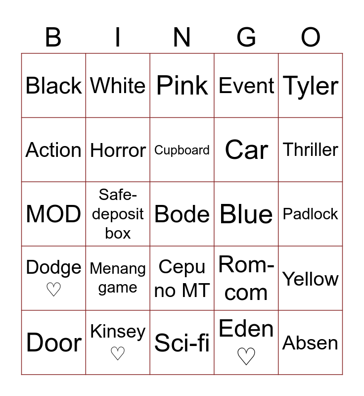 This bingo card has 25 words: Dodge ♡, Kinsey ♡, Bode, Eden ♡, Tyler, Black, White, Pink, Blue, Yellow, Action, Horror, Sci-fi, Rom-com, Thriller, Door, Safe-deposit box, Cupboard, Car, Padlock, MOD, Menang game, Cepu no MT, Event and Absen.