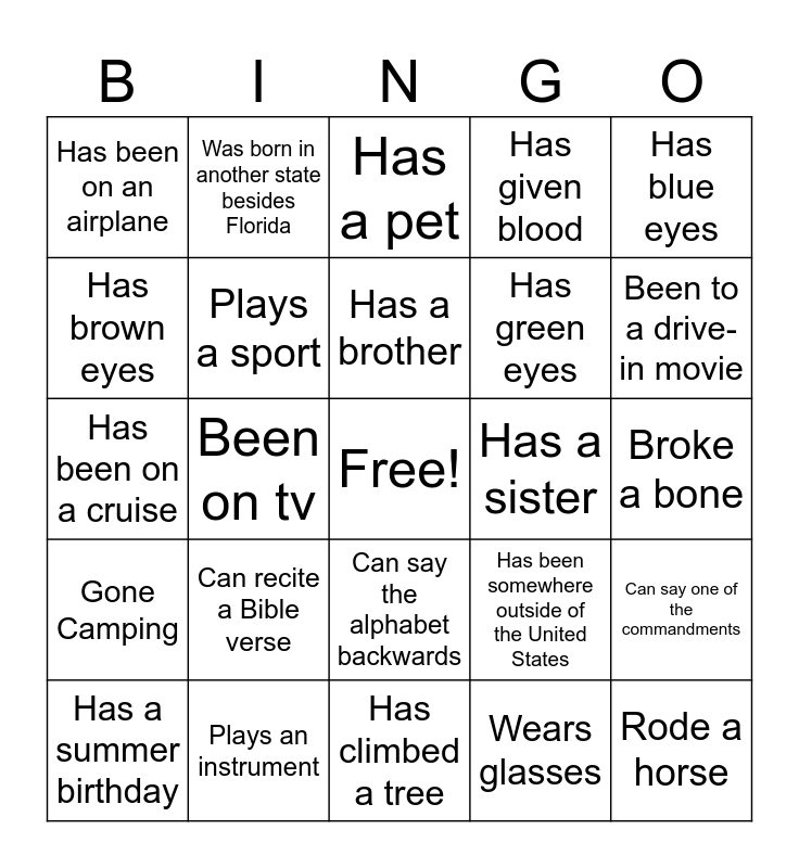 This bingo card has a free space and 24 words: Can recite a Bible verse, Plays an instrument, Has a brother, Has a summer birthday, Has blue eyes, Has been on an airplane, Has brown eyes, Was born in another state besides Florida, Has a sister, Can say the alphabet backwards, Has green eyes, Has been on a cruise, Has been somewhere outside of the United States, Can say one of the commandments, Plays a sport, Wears glasses, Broke a bone, Has a pet, Been to a drive-in movie, Been on tv, Rode a horse, Gone Camping, Has given blood and Has climbed a tree.