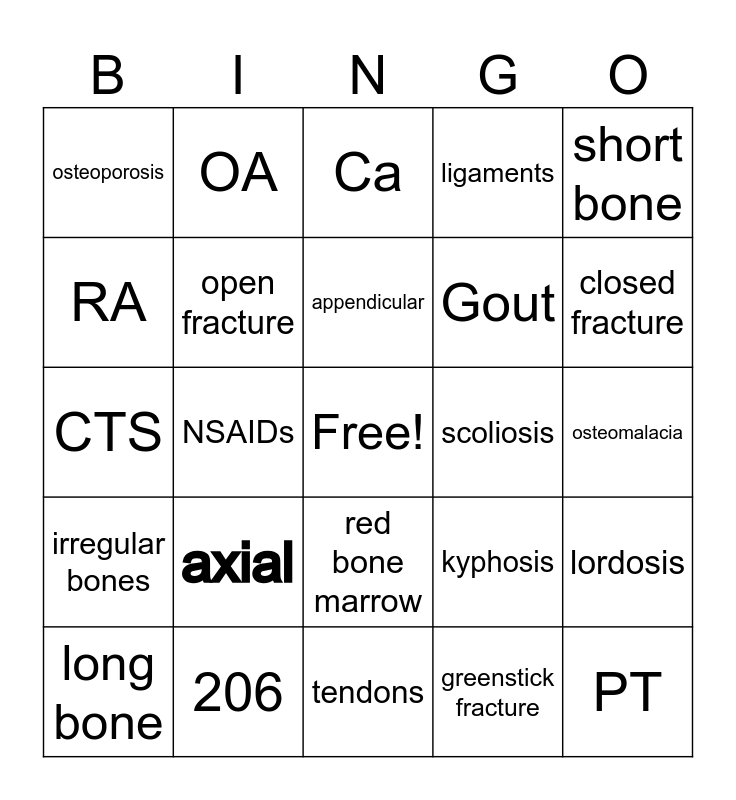 This bingo card has a free space and 24 words: axial, 206, appendicular, long bone, short bone, osteoporosis, RA, OA, scoliosis, red bone marrow, Gout, CTS, kyphosis, lordosis, open fracture, greenstick fracture, osteomalacia, Ca, closed fracture, NSAIDs, PT, irregular bones, ligaments and tendons.