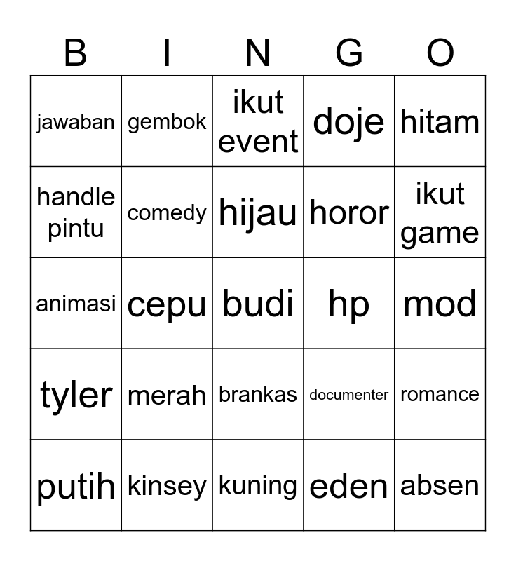 This bingo card has 25 words: merah, kuning, hijau, putih, hitam, jawaban, handle pintu, gembok, hp, brankas, horor, animasi, documenter, romance, comedy, absen, mod, ikut event, ikut game, cepu, budi, kinsey, tyler, doje and eden.