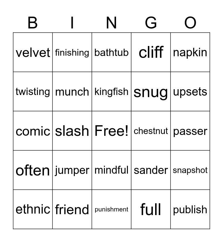 This bingo card has a free space and 60 words: want, friend, pull, often, full, push, munch, brisk, snug, throb, cliff, shock, twisting, quit, sold, velvet, publish, napkin, cabin, kingfish, chestnut, bathtub, ethnic, snapshot, inhabit, disrupt, extended, editing, upsets, limited, mascots, fantastic, insistent, consistent, finishing, rust, slob, slash, shrunk, comic, thriller, jumper, passer, planter, sander, quickest, wildest, softer, shopping, mindful, punishment, contentment, investment, fistful, thankless, runner, madness, swished, mending and noods.