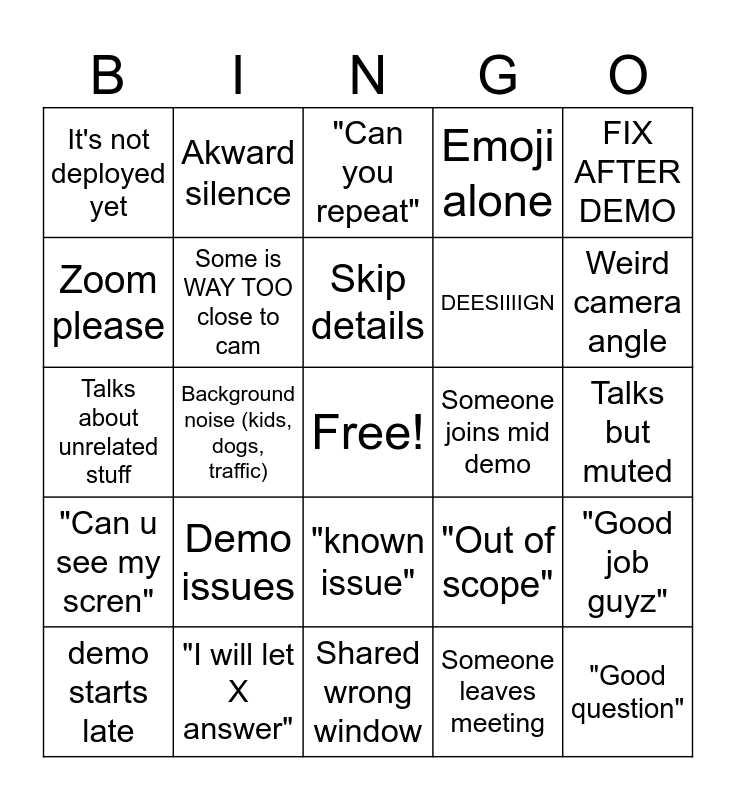 This bingo card has a free space and 25 words: Demo issues, Shared wrong window, Skip details, demo starts late, FIX AFTER DEMO, It's not deployed yet, Zoom please, Akward silence, Someone joins mid demo, "known issue", DEESIIIIGN, Talks about unrelated stuff, "Out of scope", "Good job guyz", Some is WAY TOO close to cam, Creates MR during demo, Talks but muted, "Can you repeat", Weird camera angle, Background noise (kids, dogs, traffic), "Good question", "I will let X answer", "Can u see my scren", Emoji alone and Someone leaves meeting.