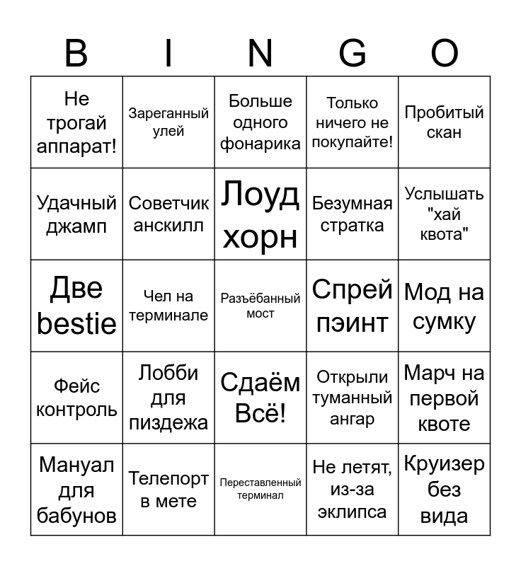 This bingo card has 25 words: Лобби для пиздежа, Переставленный терминал, Лоуд хорн, Мануал для бабунов, Пробитый скан, Не трогай аппарат!, Удачный джамп, Зареганный улей, Спрей пэинт, Сдаём Всё!, Безумная стратка, Две bestie, Открыли туманный ангар, Марч на первой квоте, Советчик анскилл, Круизер без вида, Мод на сумку, Больше одного фонарика, Услышать "хай квота", Чел на терминале, Разъёбанный мост, Телепорт в мете, Фейс контроль, Только ничего не покупайте! and Не летят, из-за эклипса.
