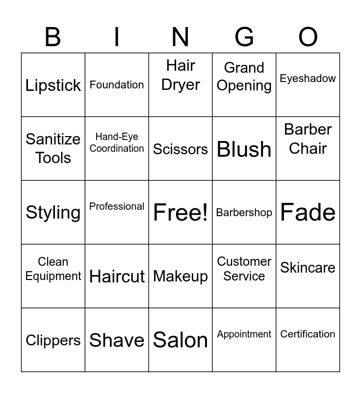 This bingo card has a free space and 24 words: Haircut, Shave, Scissors, Clippers, Eyeshadow, Lipstick, Sanitize Tools, Foundation, Barbershop, Makeup, Blush, Styling, Customer Service, Skincare, Hand-Eye Coordination, Appointment, Fade, Hair Dryer, Barber Chair, Professional, Certification, Clean Equipment, Grand Opening and Salon.