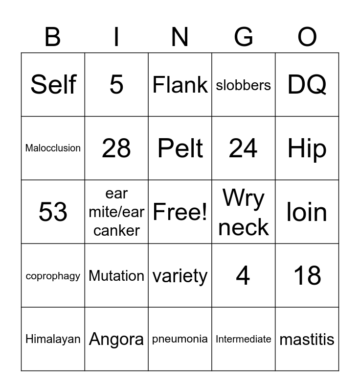 This bingo card has a free space and 24 words: Mutation, Angora, Pelt, Himalayan, DQ, Self, Malocclusion, 5, Wry neck, variety, 24, 53, 4, 18, 28, Intermediate, loin, Flank, Hip, ear mite/ear canker, mastitis, coprophagy, slobbers and pneumonia.