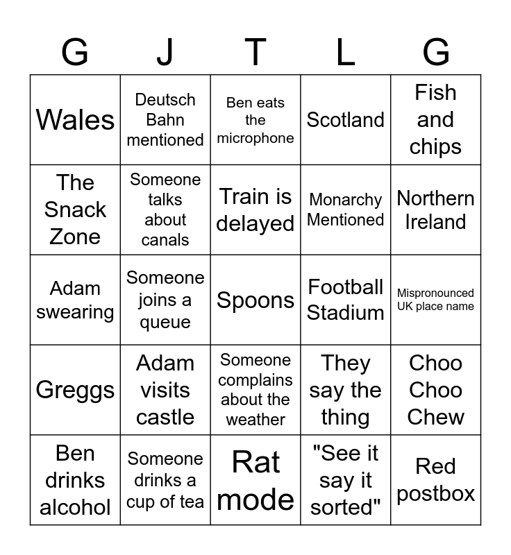 This bingo card has 25 words: Adam visits castle, Rat mode, Train is delayed, Ben drinks alcohol, Fish and chips, Wales, The Snack Zone, Deutsch Bahn mentioned, Football Stadium, Someone complains about the weather, Monarchy Mentioned, Adam swearing, They say the thing, Choo Choo Chew, Someone talks about canals, Red postbox, Mispronounced UK place name, Ben eats the microphone, Northern Ireland, Someone joins a queue, Spoons, Someone drinks a cup of tea, Greggs, Scotland and "See it say it sorted".