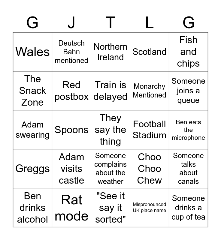 This bingo card has a free space and 24 words: Adam visits castle, Rat mode, Train is delayed, Ben drinks alcohol, Fish and chips, Wales, The Snack Zone, Deutsch Bahn mentioned, Football Stadium, Someone complains about the weather, Monarchy Mentioned, Adam swearing, Choo Choo Chew, Someone talks about canals, Red postbox, Mispronounced UK place name, Ben eats the microphone, Northern Ireland, Someone joins a queue, Spoons, Someone drinks a cup of tea, Greggs, Scotland and "See it say it sorted".