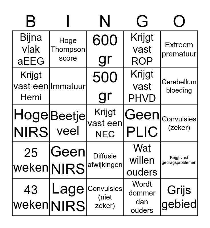 This bingo card has 33 words: Grijs gebied, MRI gemaakt, Beetje veel, 24 weken, 25 weken, Immatuur, Extreem prematuur, 43 weken, Hoge Thompson score, Trisomie, 500 gr, 600 gr, Wat vond .. van de MRI?, Ouders uit Tilburg, Geen PLIC, Cerebellum bloeding, Lage NIRS, Hoge NIRS, Geen NIRS, Wat willen ouders, Diffusie afwijkingen, Vlak aEEG, Bijna vlak aEEG, Convulsies (zeker), Convulsies (niet zeker), Krijgt vast een NEC, Krijgt vast ROP, Krijgt vast PHVD, Krijgt vast een Hemi, Krijgt vast gedragsproblemen, Moet naar speciaal onderwijs, Wordt dommer dan ouders and Sociaal zwak milieu.