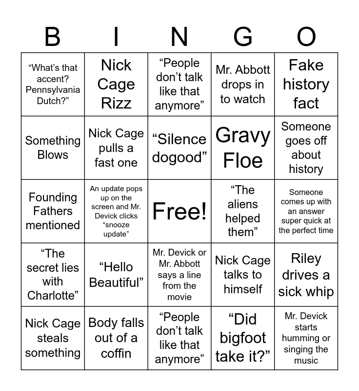 This bingo card has a free space and 27 words: Nick Cage talks to himself, Police are bad at their jobs, Gravy Floe, “People don’t talk like that anymore”, Something Blows, “People don’t talk like that anymore”, Nick Cage Rizz, “The secret lies with Charlotte”, “The aliens helped them”, Riley drives a sick whip, Founding Fathers mentioned, Mr. Abbott drops in to watch, Nick Cage steals something, Body falls out of a coffin, Someone goes off about history, Nick Cage’s dad is duct taped to a chair, Nick Cage pulls a fast one, “Silence dogood”, “Hello Beautiful”, “What’s that accent? Pennsylvania Dutch?”, Someone comes up with an answer super quick at the perfect time, “Did bigfoot take it?”, An update pops up on the screen and Mr. Devick clicks “snooze update”, Mr. Devick starts humming or singing the music, Mr. Devick or Mr. Abbott says a line from the movie, Fake history fact and Real history fact.